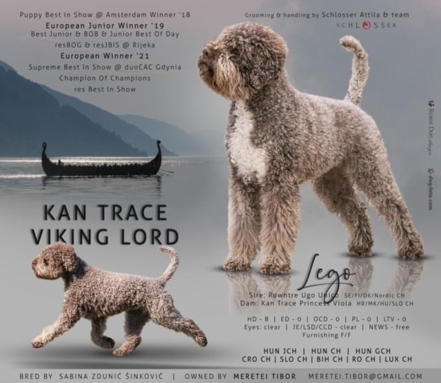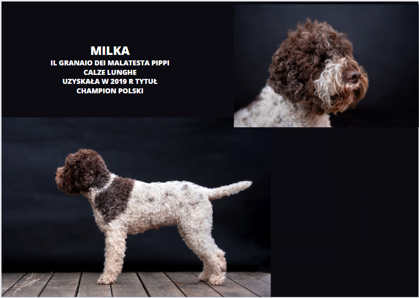 Oboje rodzice są importowani – Milka z Włoch – kolebki psów rasy Lagotto Romagnolo a ojciec z Chorwacji , z utytułowanej hodowli Kan Trace i aktualnie zamieszkuje na Węgrzech. Ojciec i matka przebadani na choroby obciążające rasę – wszystkie testy ujemne.